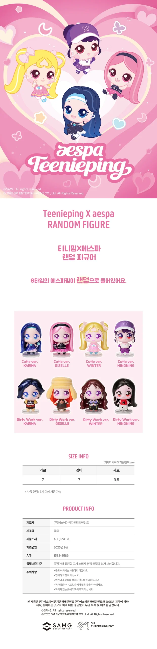 Since this product is random, the figure you receive will be a surprise! Each mystery box contains one AESPA member figure from the TEENIEPING collaboration lineup. Collect all versions to complete the set and showcase AESPA’s colorful world.