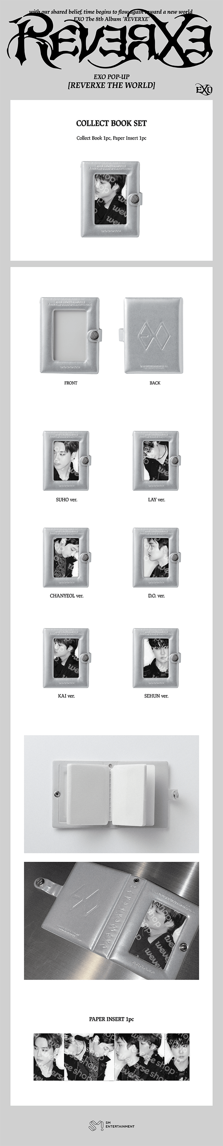 The EXO collect book from the Reverxe the World pop-up collection is a refined and practical item created for fans who love organizing and preserving their favorite collectibles. Designed specifically for photocard-sized inserts, this compact collect book combines durability with a clean, stylish appearance that fits seamlessly into any EXO collection.